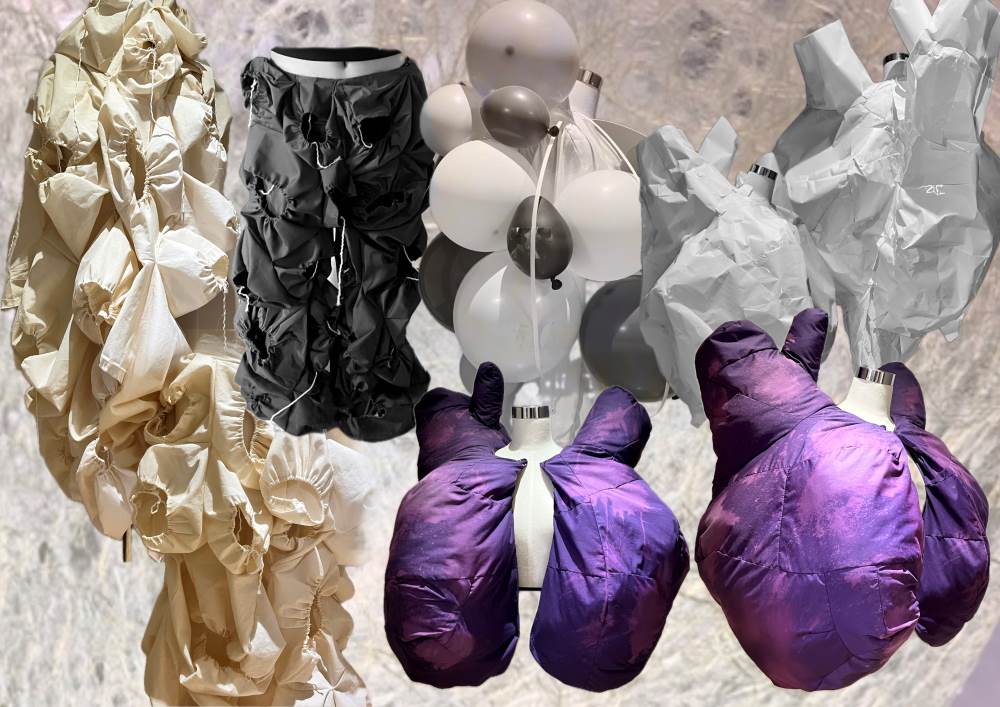 – 공허한 마음을 들키지 않으려 겉으로 밝아 보이는 느낌을 나타내기 위해 밝은 색상 원단을 사용하며 실루엣을 과장되고 부풀려서 속을 꽉 채워 놓은 듯한 착각을 준다.
